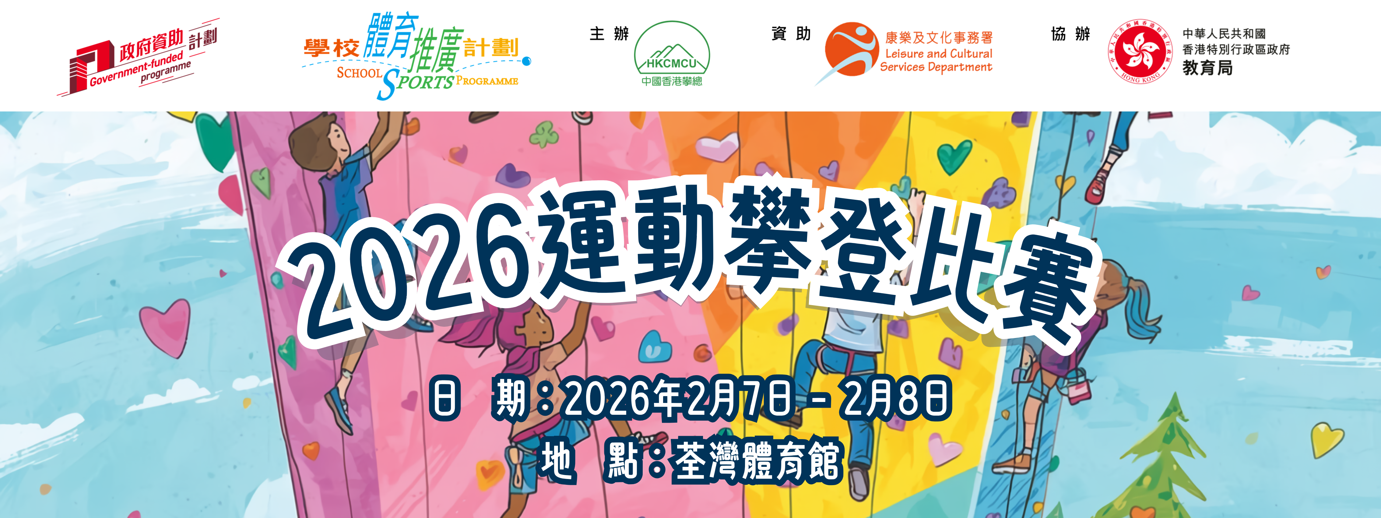 由中國香港攀山及攀登總會有限公司主辦,康樂及文化事務署資助,教育局協辦,學校體育推廣計劃 2026運動攀登比賽將於2026年2月7日至8日於荃灣體育館舉行。本活動旨在為參與「學校體育推廣計劃」運動攀登訓練的學員提供一個交流的機會,從而提高他們對運動攀登的興趣,讓同學們累積比賽經驗,提升技術水平。